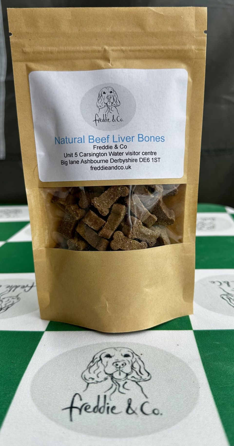 Freddie & Co natural beef liver treats contain 100% beef liver meats all gently steamed and compressed into mini bone shaped rewards which are not only tasty, but perfect for training and sharing too. Comes in a 100g pouch, also available in pork with apple bones, Ostrich Bones & Cheese bones.