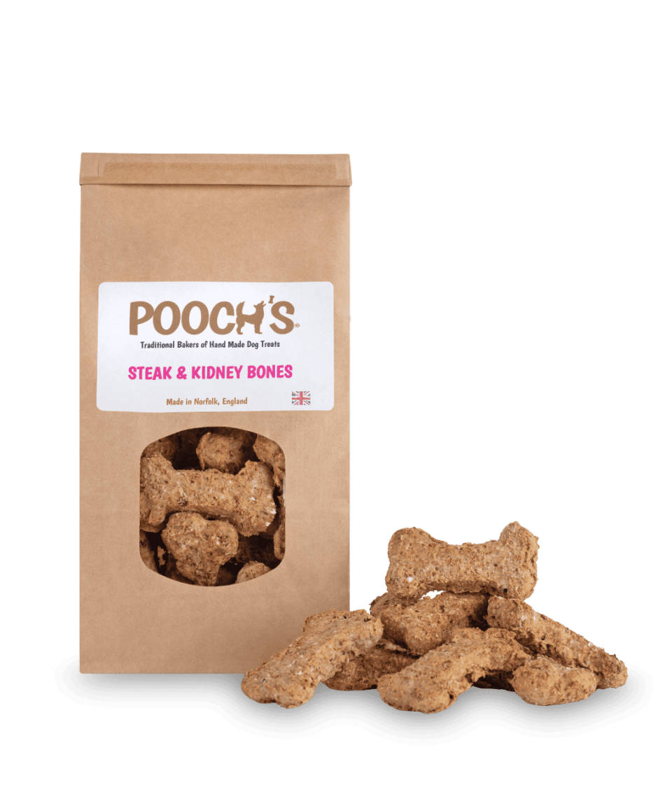 STEAK & KIDNEY BONES A very popular biscuit with all our regulars! Contains 40% total meat content per 100gms, which is very hard to beat! Full of Selenium, Phosphorous & Zinc which helps build muscle. Composition; Beef Skirt (30%) Pigs Kidney (5%) Flour, Oats, Bran, Rapeseed oil. Typical Analysis: Crude Protein 17.5% – Crude Oil 6.3 % – Crude Fibre 1.3 % – Crude Ash 1.0 %. Each bag contains 250 gms
